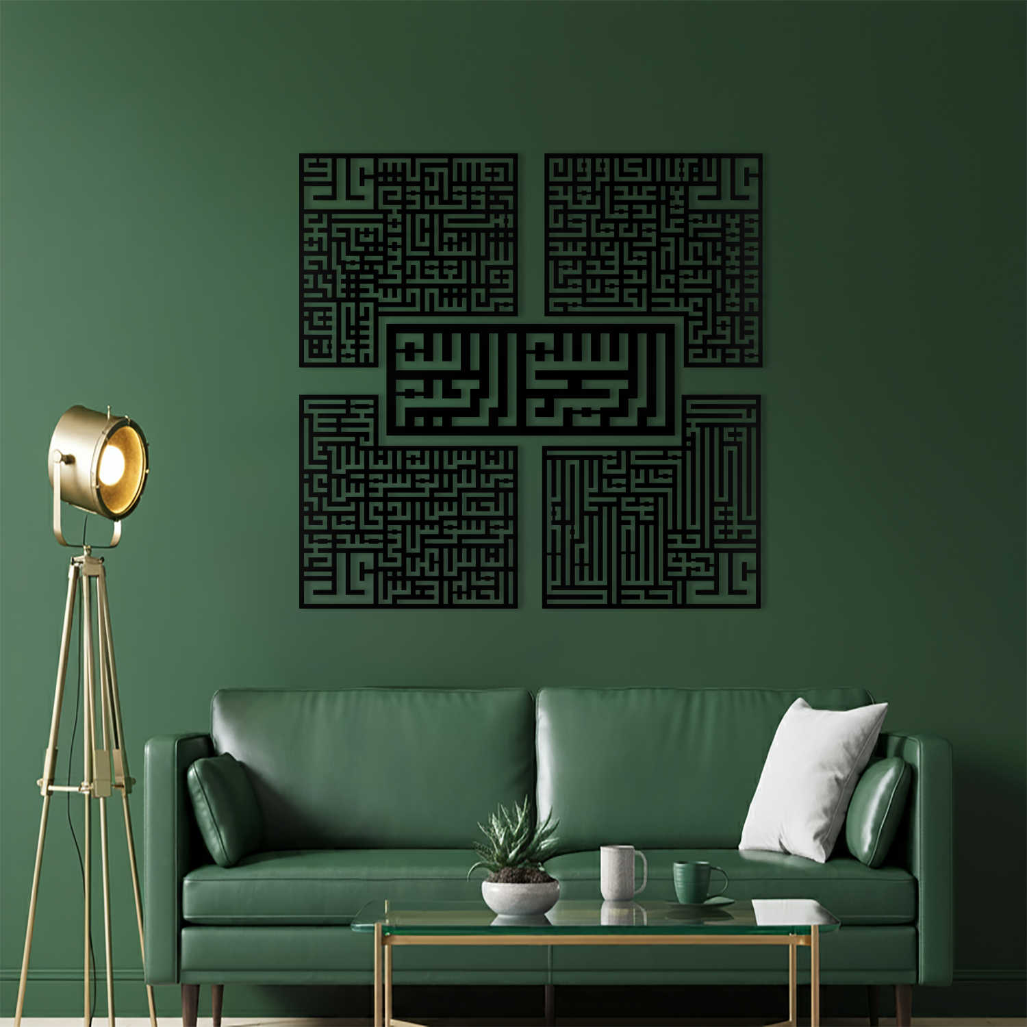Dört kutsal sûreyi Kufi hat sanatıyla birleştiren bu tablo seti, dekorasyonunuza manevi bir dokunuş katacaktır.