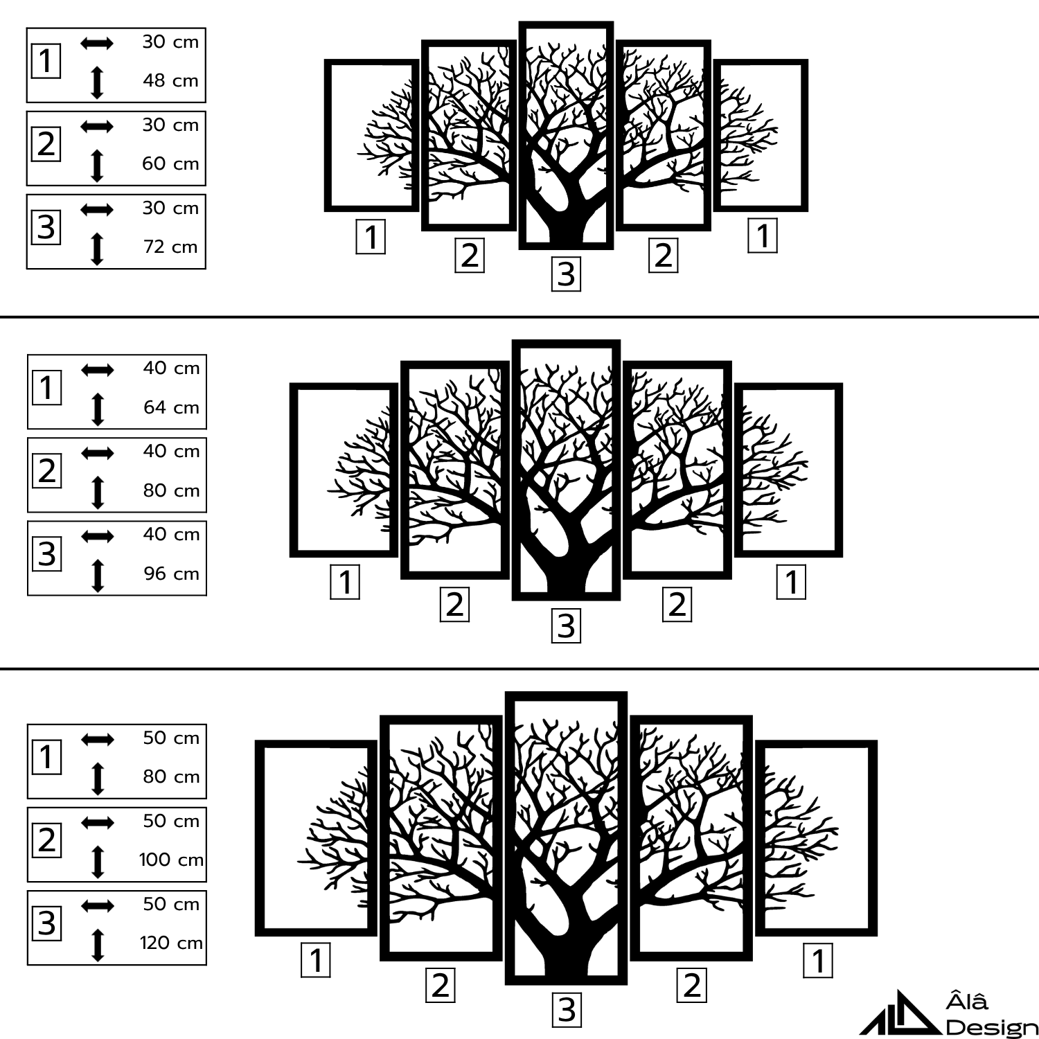 – Small: 1 nolu parça 30×48 cm, 2 nolu 30×60 cm, 3 nolu 30×72 cm